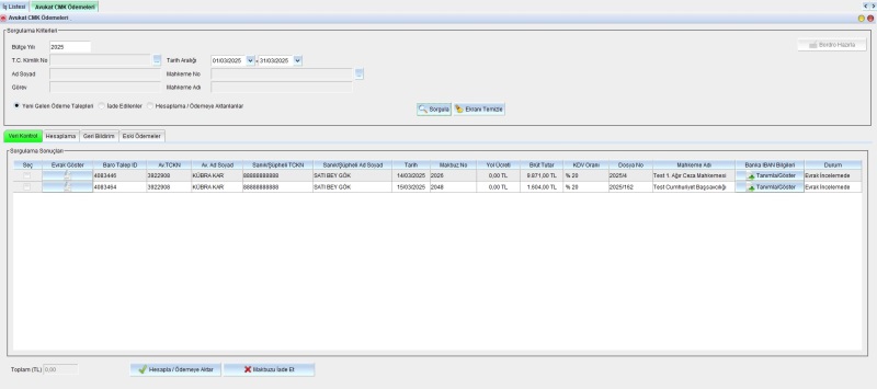 İdari işler müdürlükleri inceleme neticesinde gerekli belgelerde eksiklik olmaması durumunda avukata ödeme yapılmak üzere bordroları hesaplayacak, Maliye Bakanlığının Harcama Yönetim Sistemine (HYS) avukat tarafından onaylanan EYP paketi ile UYAP tarafından üretilen çeşitli ödemeler bordrosunu yükleyecek ve süreç tamamlanacaktır.